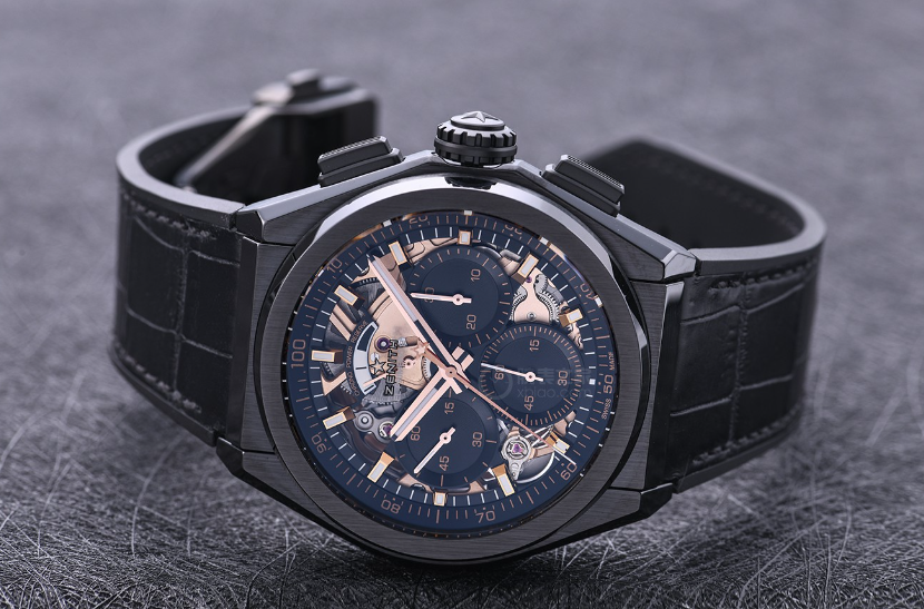真力時為這款腕錶配備了一個黑色陶瓷材質打造的錶殼,側面經拉絲工藝處理,防劃耐磨,錶殼線條硬朗,幾何感十足,帶有非常濃厚的未來設計感。另一側腕錶設有防滑輪胎狀錶冠,校時更加便捷,兩側則為方形計時按鈕,計時組件運行流暢。