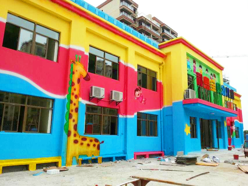 墻繪卡通圖案在幼兒園的主題墻裝飾中非常流行,成本低,效果好,為幼兒園設計中首選裝飾方法。